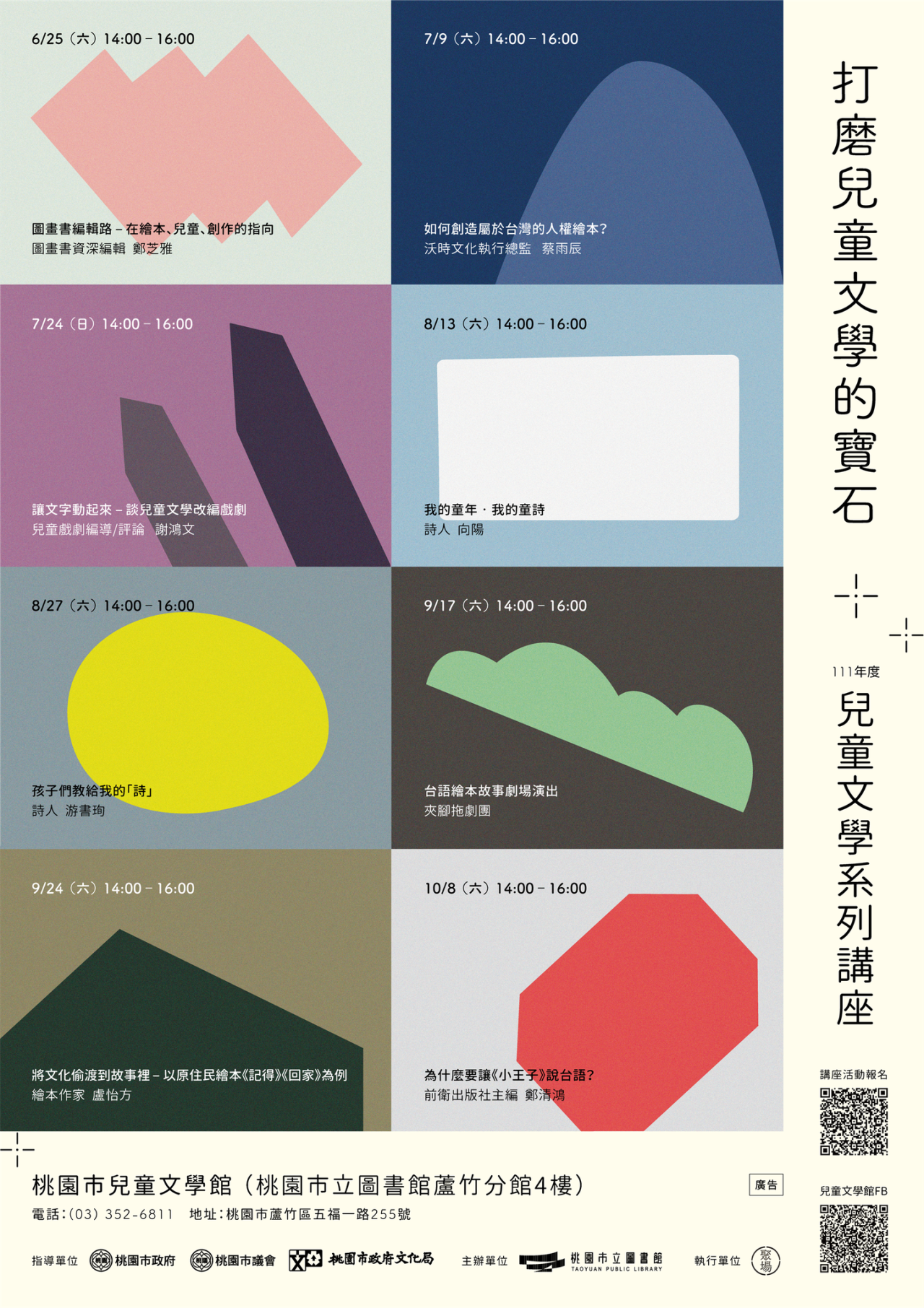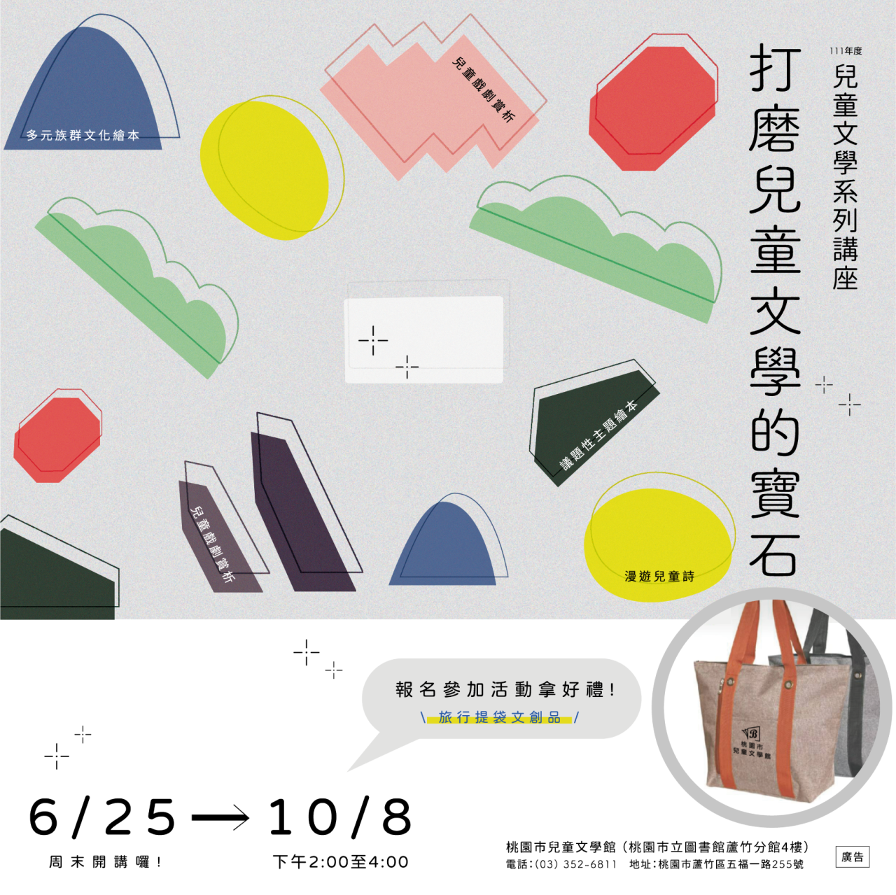 一、 本館為推廣兒童文學,開啟多元視野,提升學童想像力及閱讀能力,規劃於111年6月25日至10月8日期間辦理8場精彩講座,地點於桃園市兒童文學館(桃園市蘆竹區五福一路255號4樓),參加6月25日(六)講座即可獲得旅行提袋文創品1份,歡迎蒞臨參加。