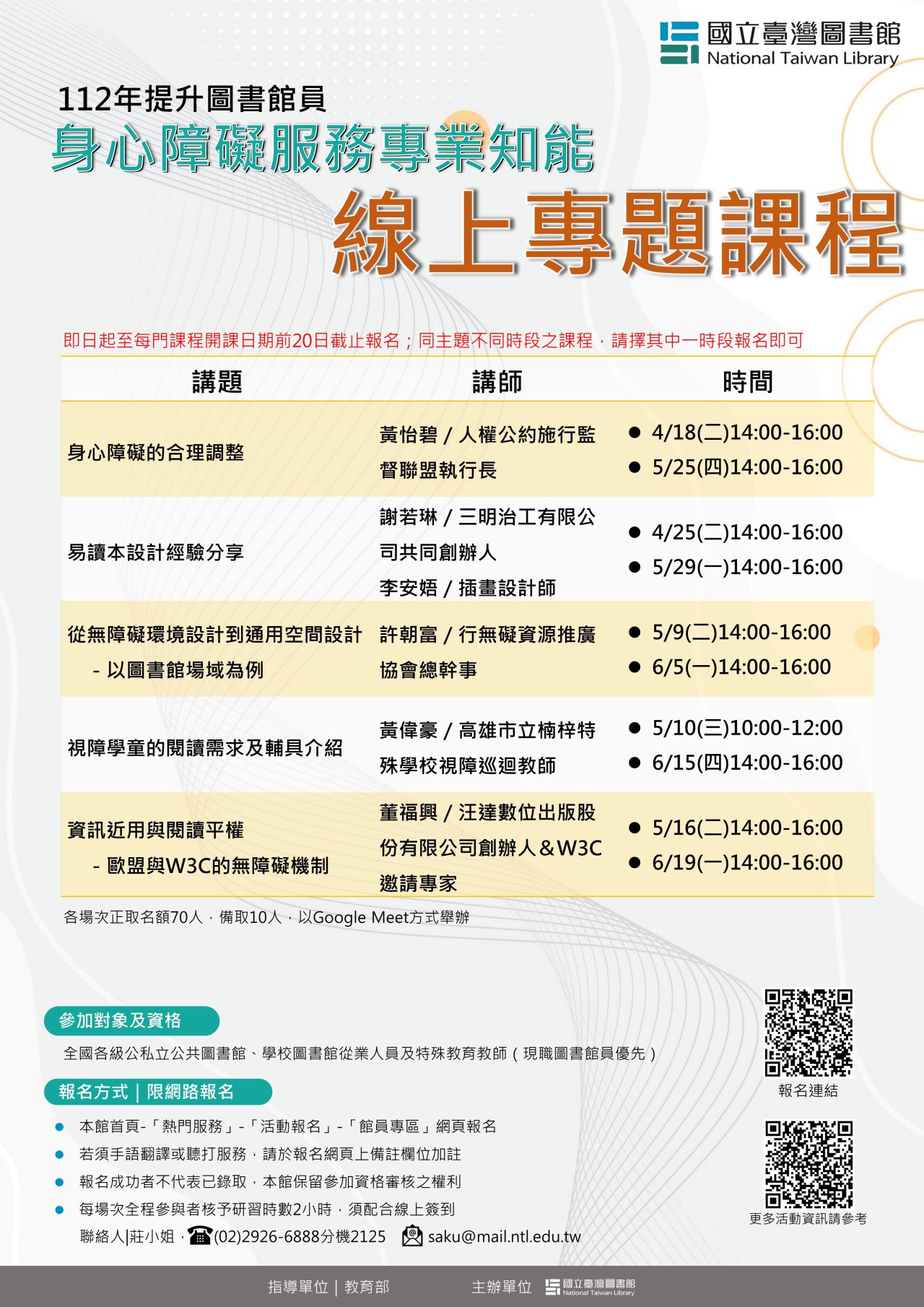 | 五、 | 課程詳細資訊歡迎參閱計畫書或逕至國立臺灣圖書館網站最新消息(https://www.ntl.edu.tw)項下查詢下載。 |