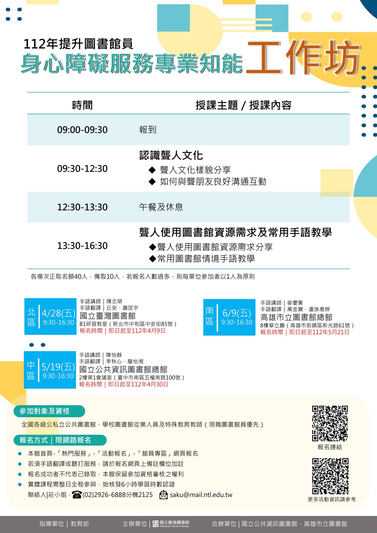 | 二、 | 旨揭課程為提升圖書館員身心障礙服務專業素養,特規劃本(112)年4至6月於國立臺灣圖書館、國立公共資訊圖書館及高雄市立圖書館辦理旨揭實體工作坊及線上專題學習課程。 |