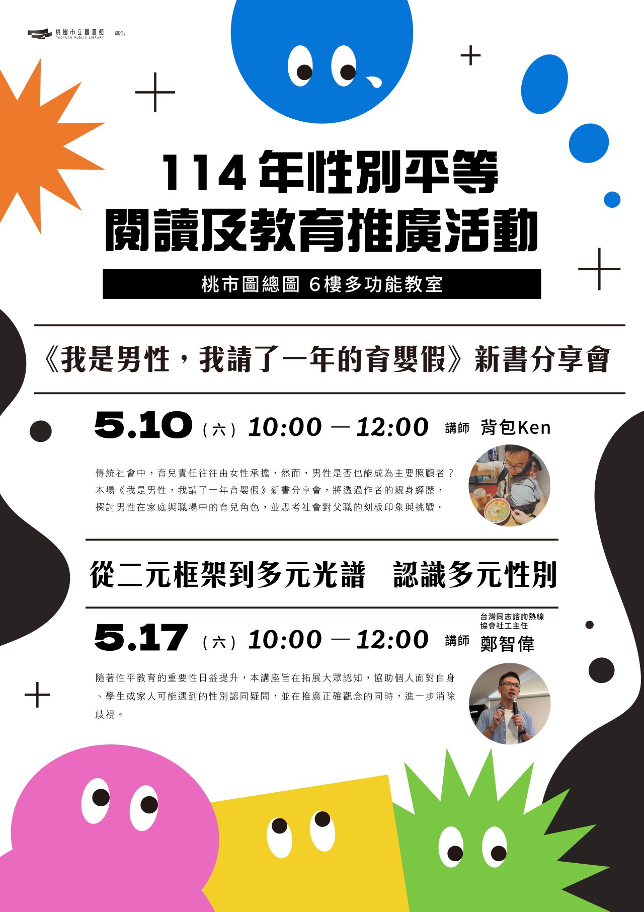 (一) 114年5月10日(星期六)上午10時至12時辦理《我是男性,我請了一年育嬰假》新書分享會,將邀請本書作者-背包Ken,分享自身請育嬰假親身經歷,探討男性在家庭與職場中的育兒角色;