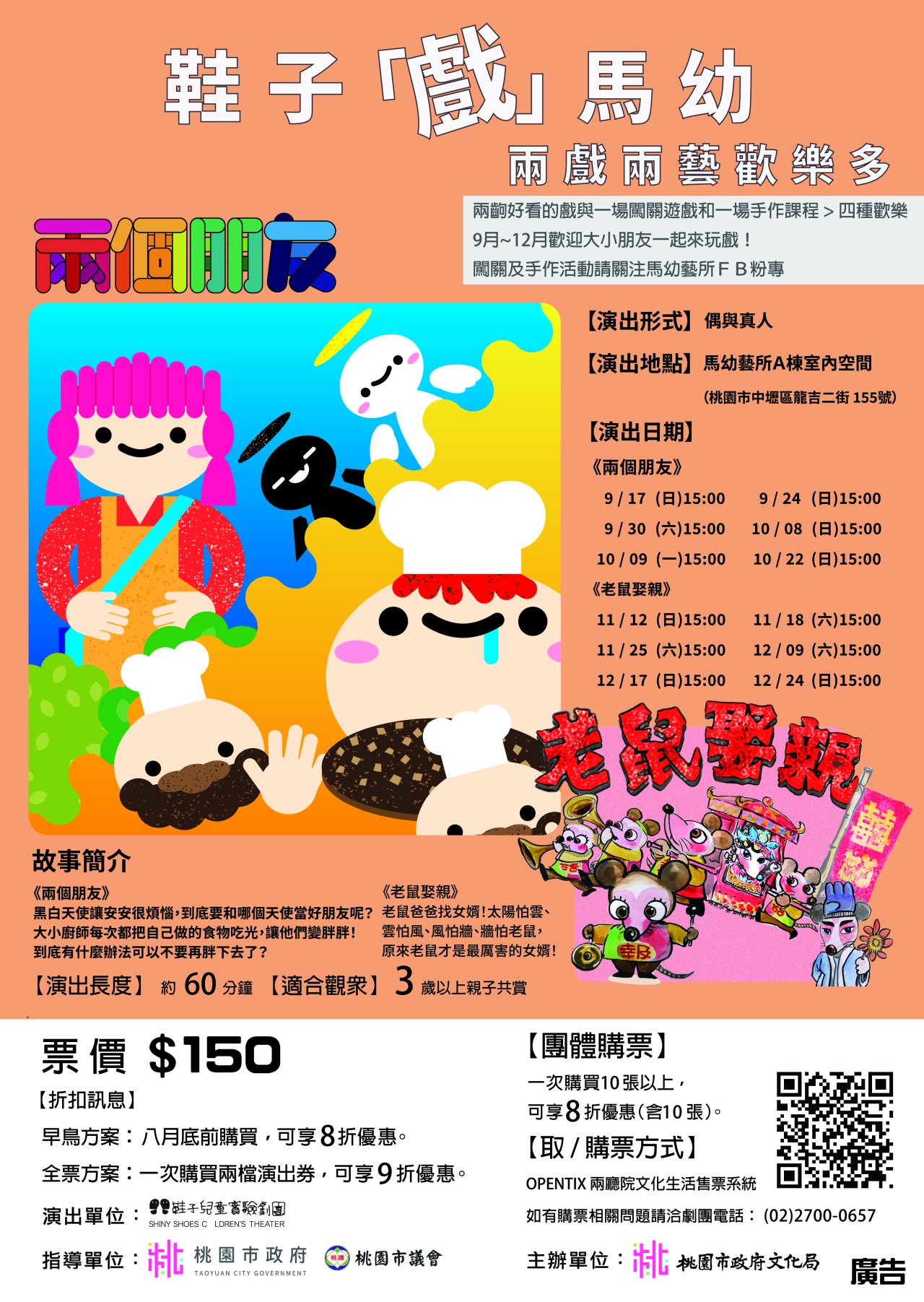 本期活動包含2齣經典兒童劇《兩個朋友》、《老鼠娶親》 演出,每場演出前後更搭配精心設計的闖關活動,完成闖 關還可獲得神秘小禮物(數量有限贈完為止);另自演出主 題延伸規劃免費手作體驗工作坊,將藝術、創意、美學等 融入生活中,歡迎親子來到眷村場域中同賞同樂。
