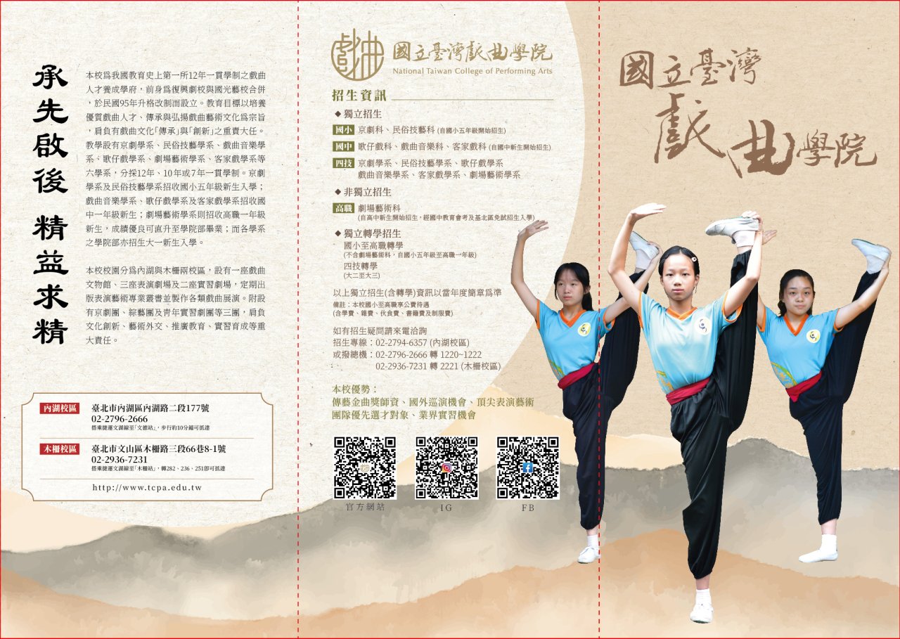 十、其它多元招生訊息請關注「國立臺灣戲曲學院招生資訊」臉書粉絲專頁(https://www.facebook.com/NTCPA.Information),亦可參考嘎校宣傳影片《劇校生的一天》(https://youtu.be/MbvBRcYr_u8?si=_v-OXf0POchqaPXn)。