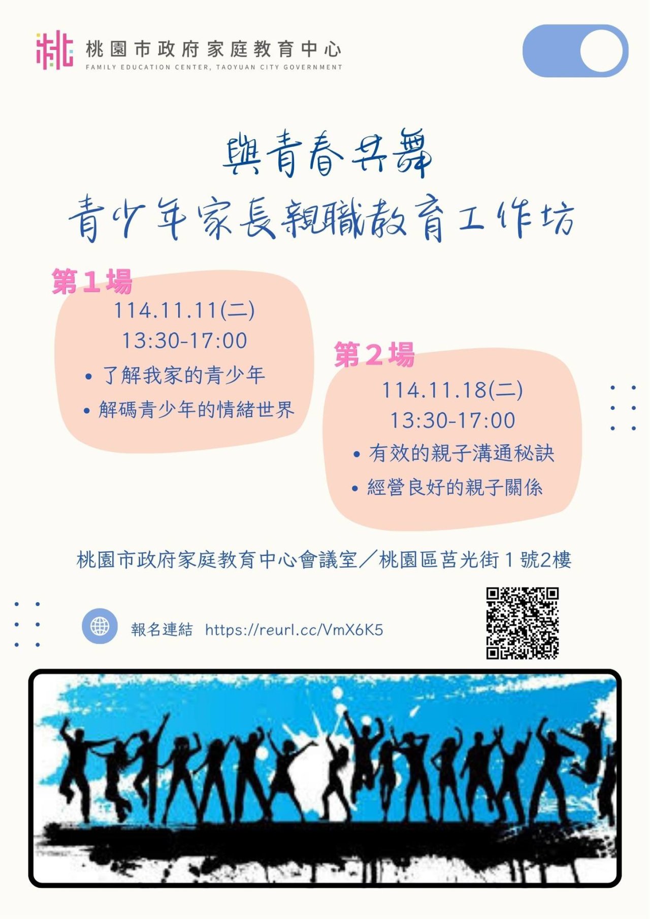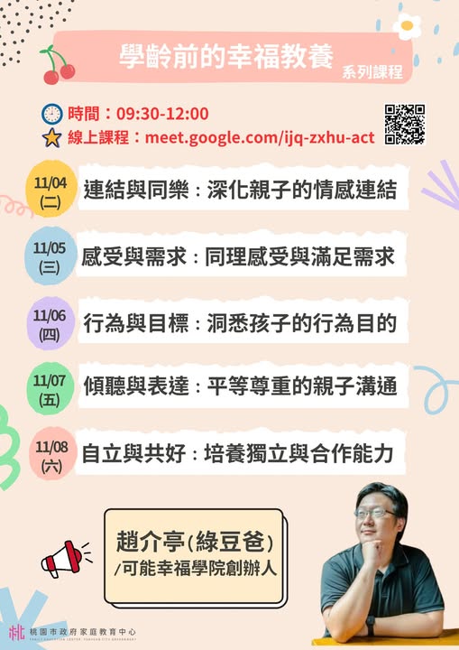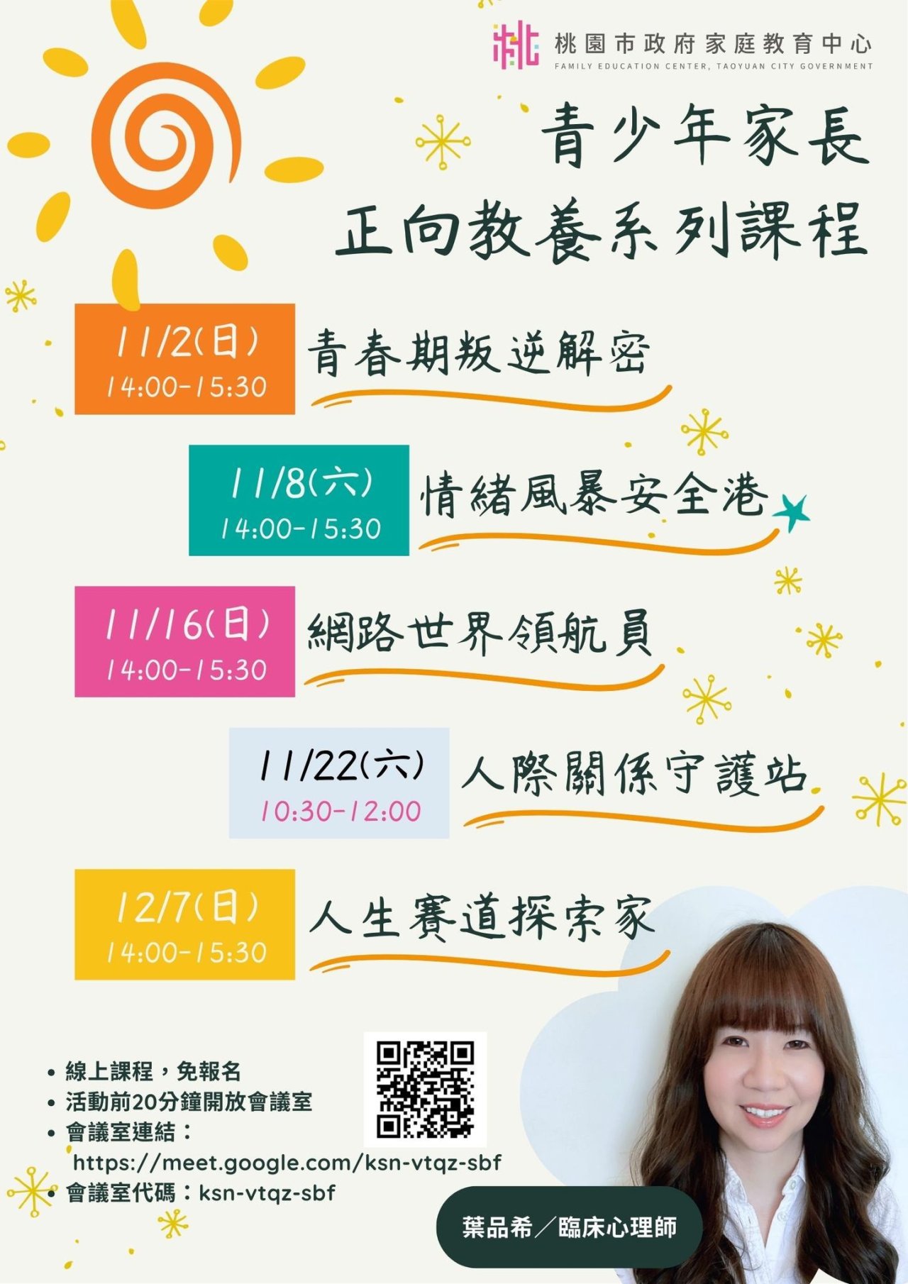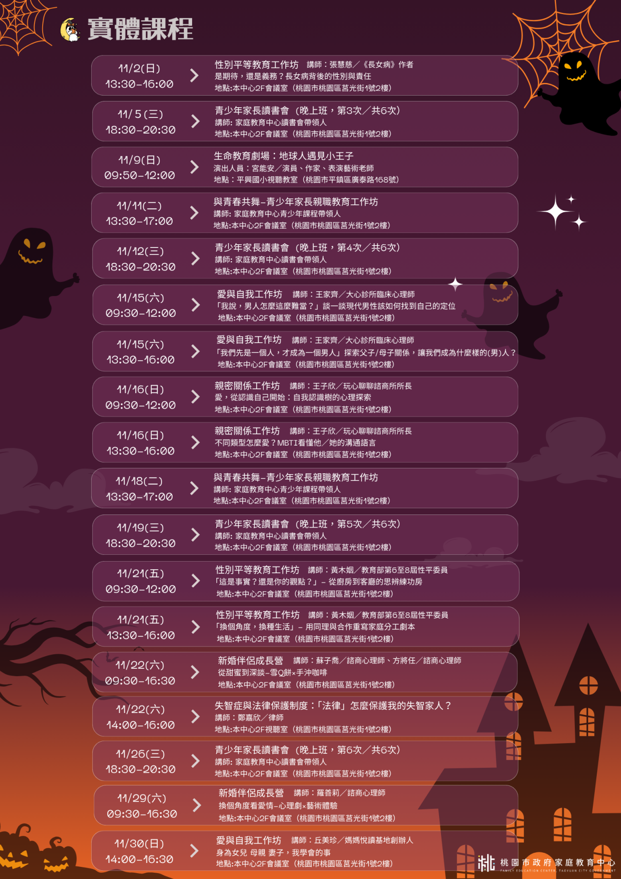 二、旨揭課程詳細資訊,請見中心課程行事曆(https://reurl.cc/xlGyGL)或追蹤「桃園市政府家庭教育中心」FB粉絲專頁;