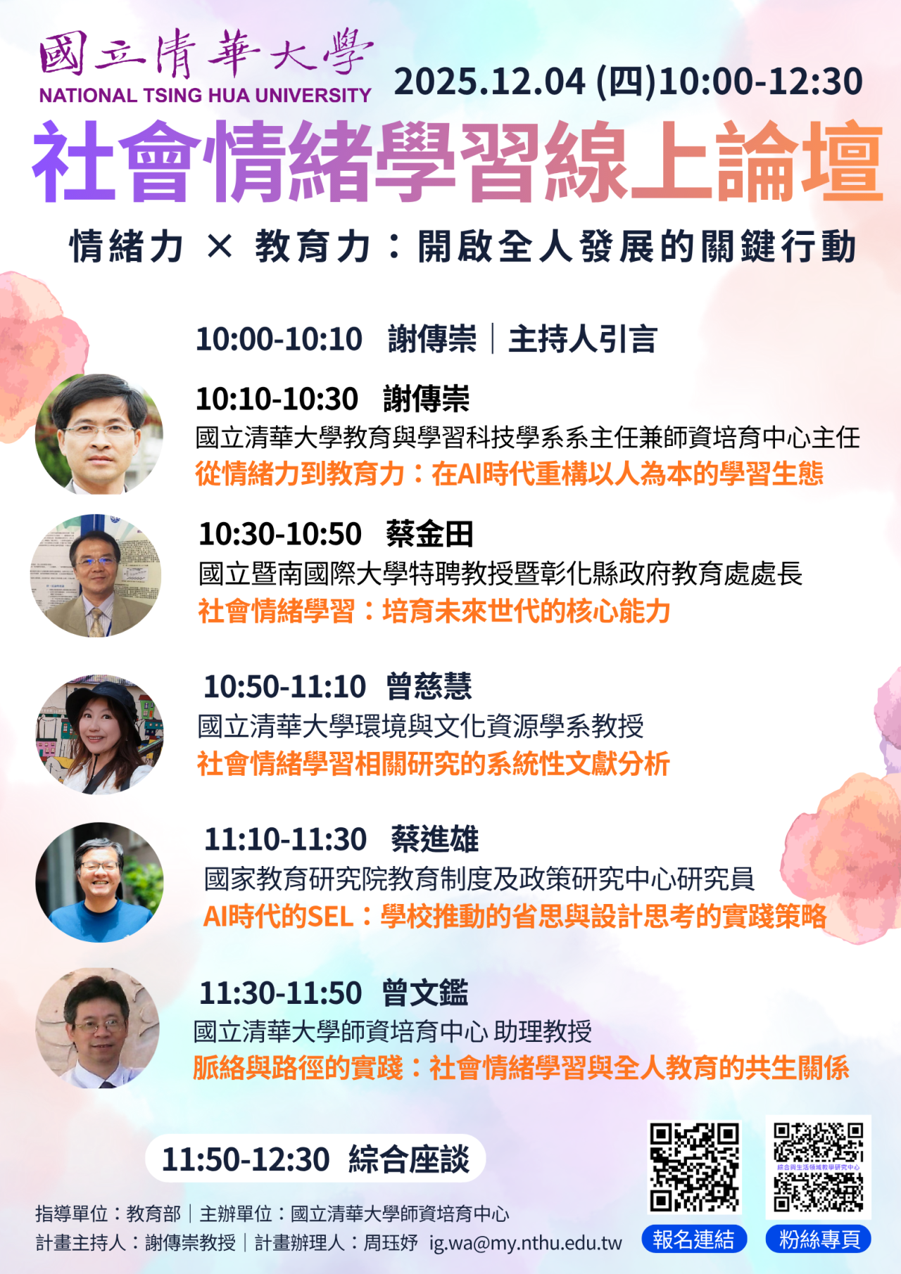 二、旨揭線上論壇係聚焦「社會情緒學習於教育領域之應用與發展」,探討如何透過提升情緒能力,促進AI時代學習者