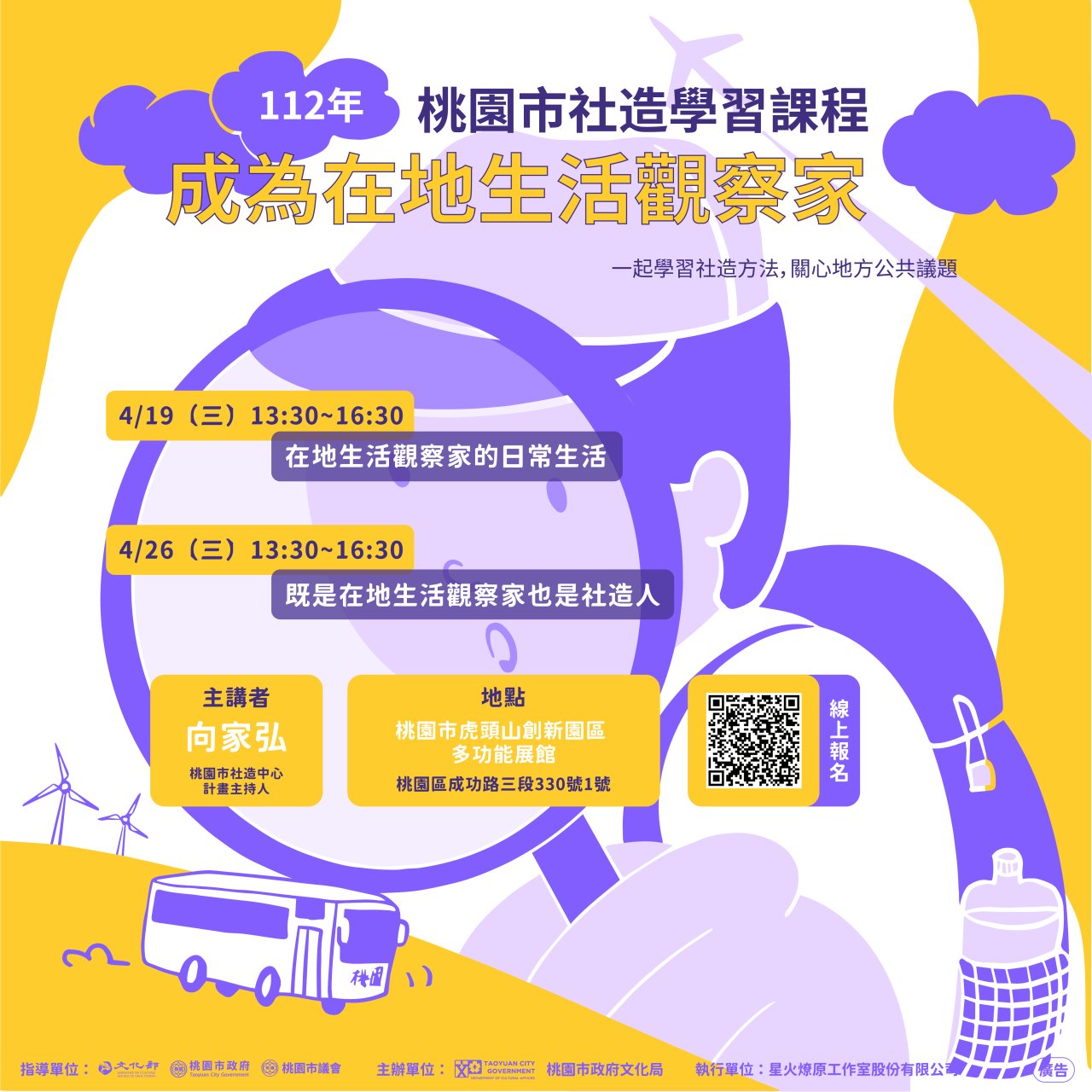 檢送本局辦理112年社造學習課程「成為在地生活觀察 家」簡章及宣傳圖檔各1份,請鼓勵所屬人員踴躍報名參 加並協助宣傳週知,請查照。