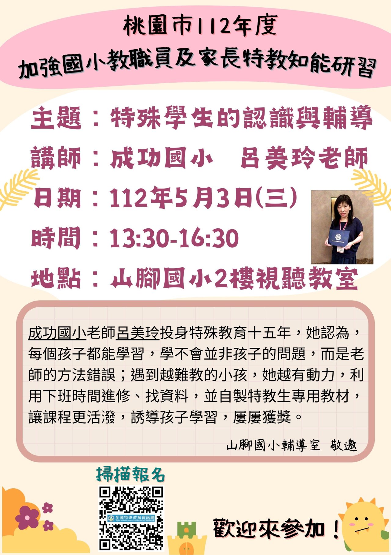 七、 報名方式:請於5月3日(三)中午12:00前至全國特殊教育資訊網(https://special.moe.gov.tw/study.php)-研習報名-縣市特教研習-桃園市-學年(111)-學期(下)登錄單位(山腳國小)報名。