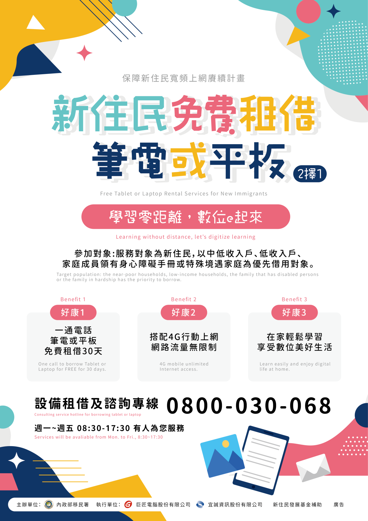 轉知內政部移民署推動「保障新住民寬頻上網賡續計 畫」,自即日起開辦「新住民免費租借筆電或平板服 務」,詳如說明,請查照。