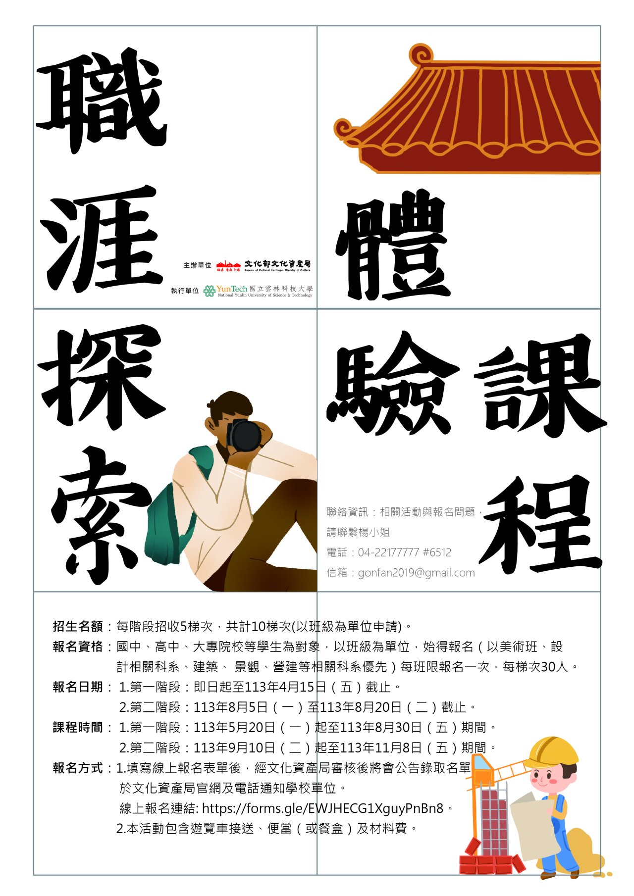 四、倘有旨揭活動相關疑義,請逕洽文化部文化資產局文資傳匠工坊楊小姐,電話:04-22177777#6512,