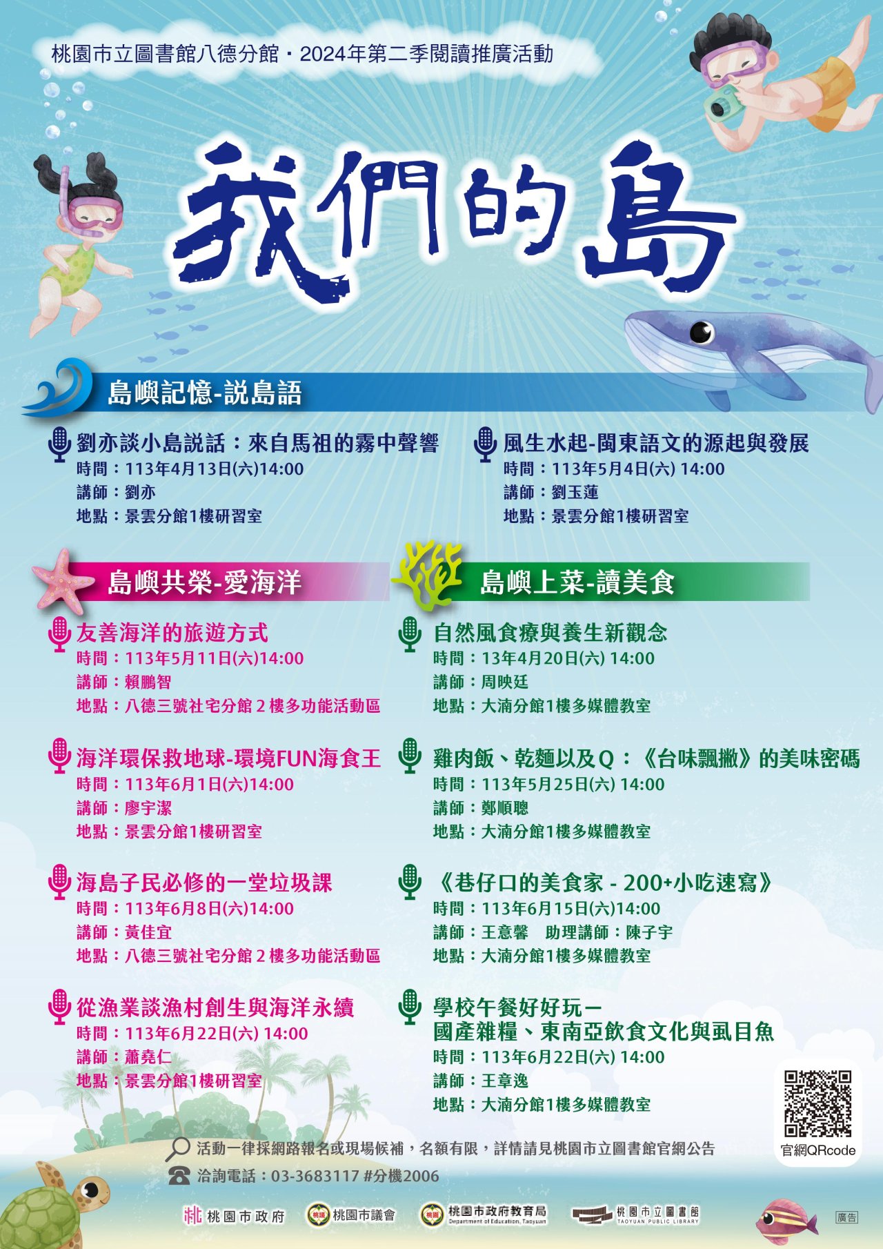 一、 八德分館2024年第二季閱讀推廣主題,以「台灣」為主軸出 發設定主題活動,以「離島文化」、「海洋保育」及「飲食 文化」三大方向,從推廣活動中使民眾再次看見台灣社會的 脈動。