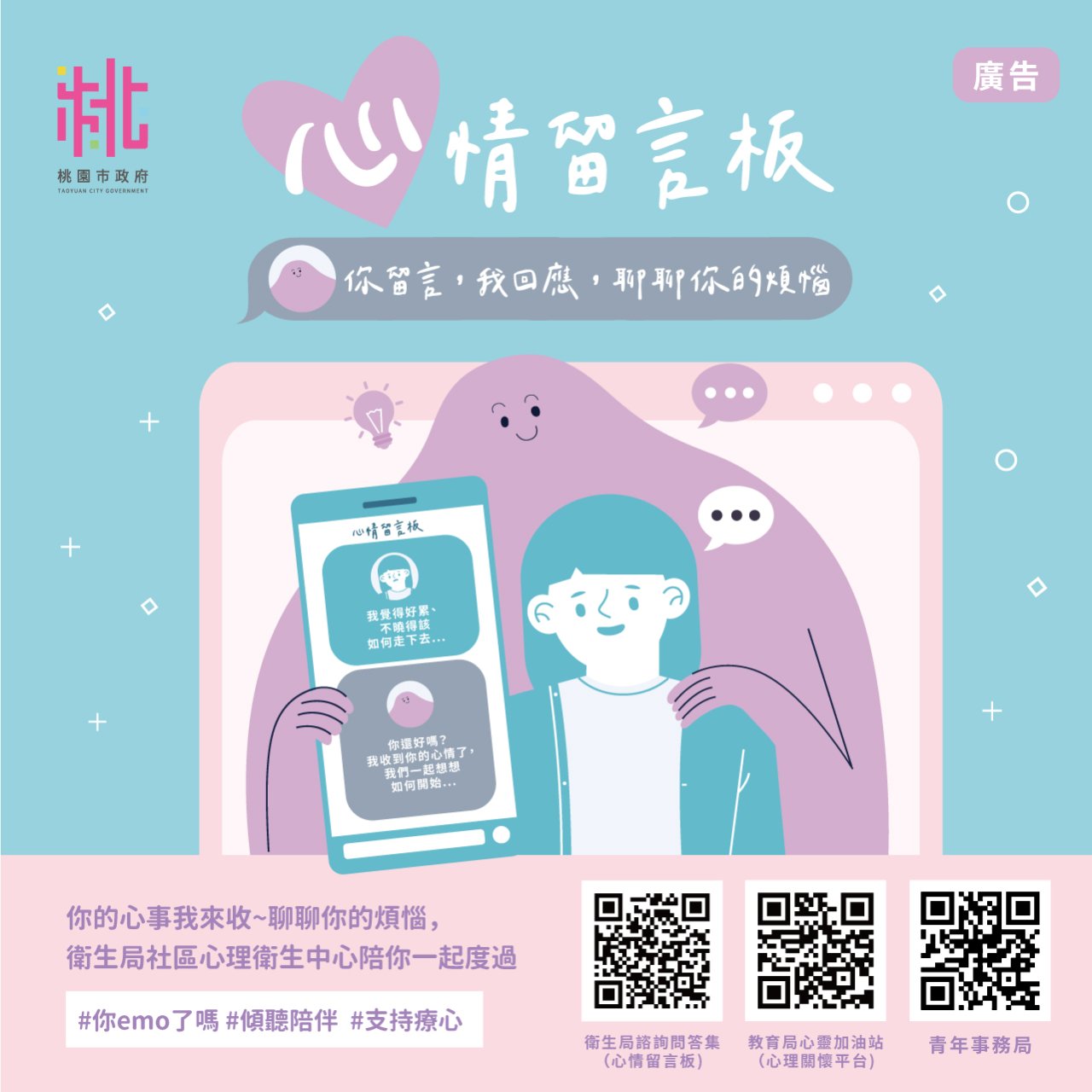 三、檢附旨揭海報電子檔(附件1至2),該檔案亦可至本府衛生局社區心理衛生中心網站 (https://mental.tycg.gov.tw/)/諮詢問答集(心情留言板)/海報下載,請轉知所屬推廣運用。
