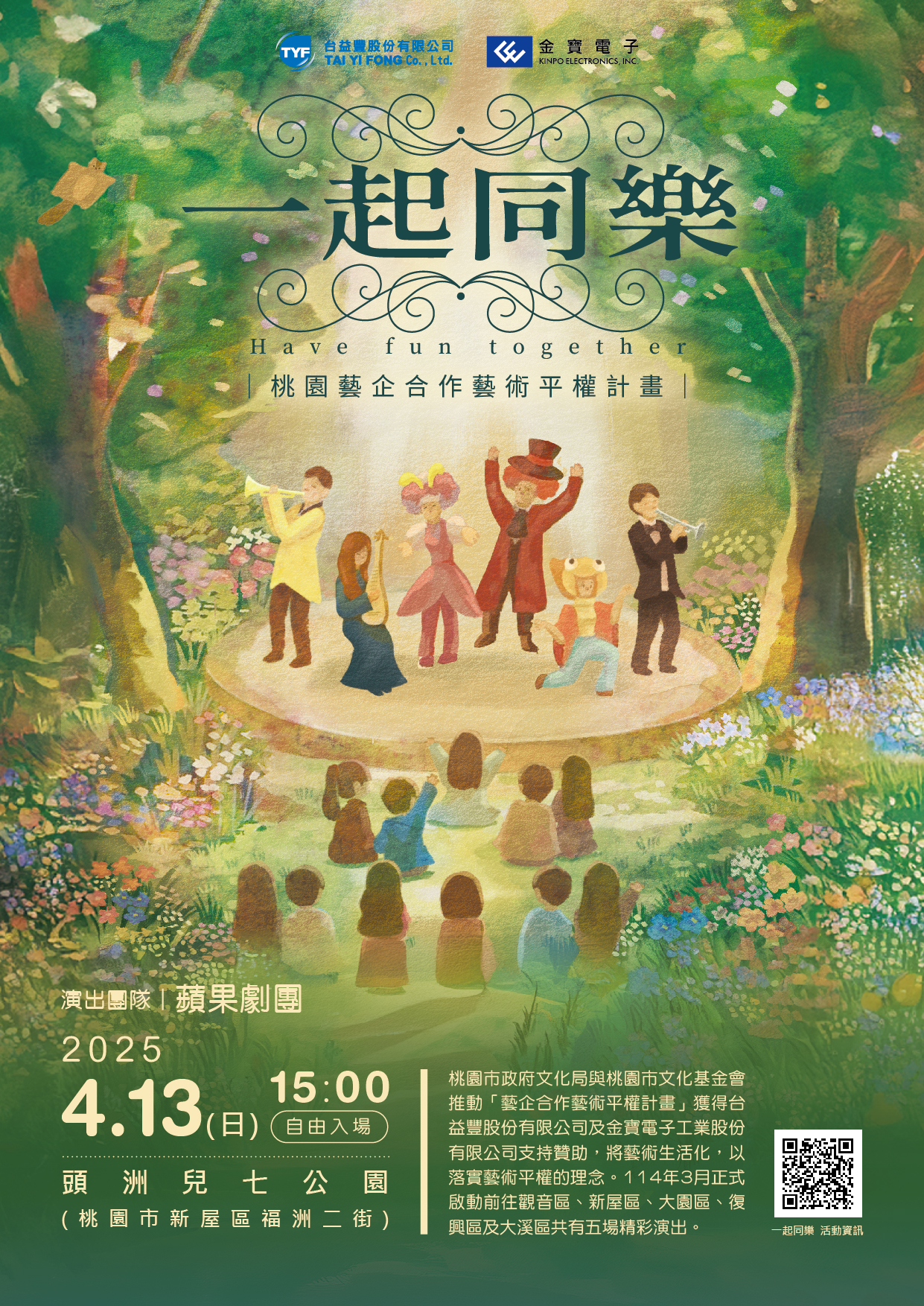 本活動定於114年4月13日(星期日)下午3時,邀請「蘋果劇團」於新屋區頭洲兒七公園(桃園市新屋區福洲二街)辦理演出。