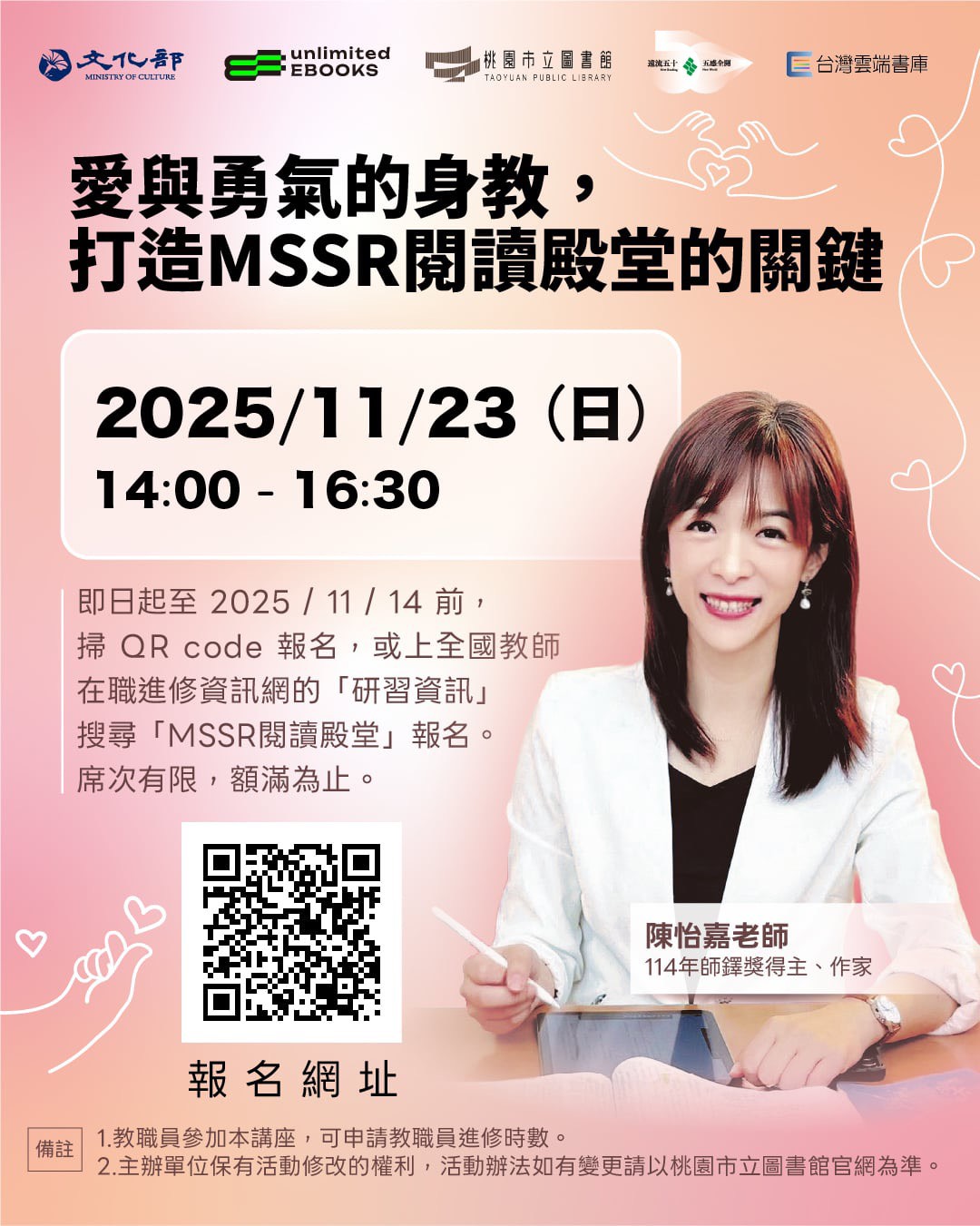 「愛與勇氣的身教,打造MSSR閱讀殿堂的關鍵」講座,歡迎多多參加。