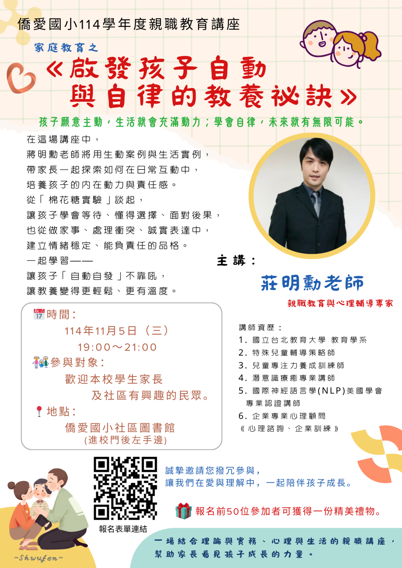 (二)講 題:啟發小孩自動與自律的教養秘訣。